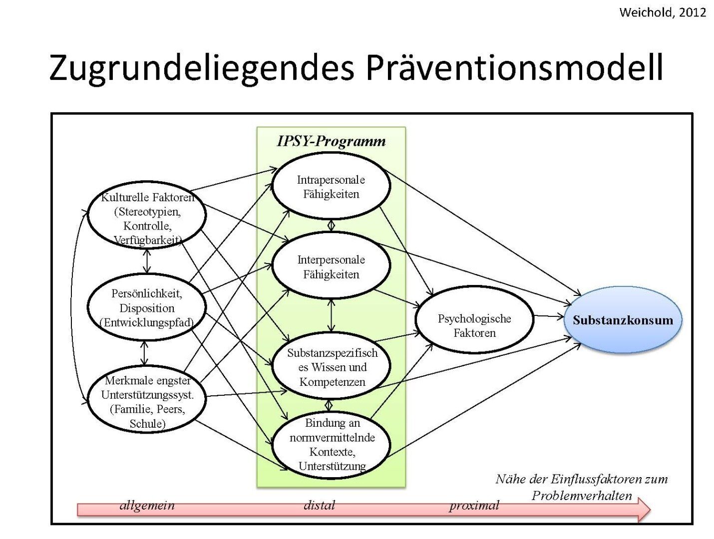 Das Programm IPSY zielt auf die Beeinflussung distal wirkender Risiko- und Protektionsfaktoren für Substanzkonsum durch die Vermittlung entsprechender Programminhalte wie Lebenskompetenzen ab.