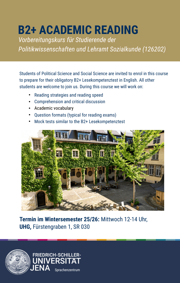 Gleichzeitig bieten wir auch einen B2+ ACADEMIC READING Vorbereitungskurs für Studierende der Politikwissenschaften und Lehramt Sozialkunde an. Dieser findet im Wintersemester 25/26 mittwochs um 12-14 Uhr statt. HierExterner Link finden ihr die Anmeldung zum Kurs.